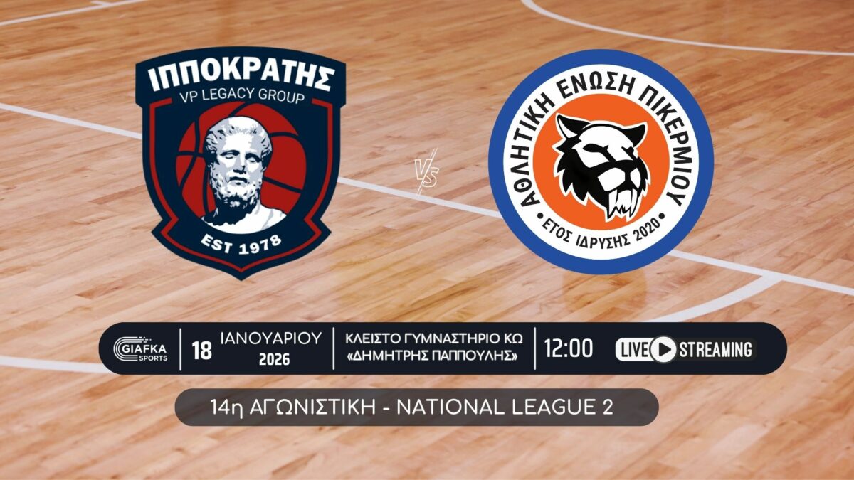 Για την 14η αγωνιστική της National League 2 o Ιπποκράτης υποδέχεται την Α.Ε Πικερμίου την Κυριακή 18/1 στις 12:00 στο Κλειστό γυμναστήριο Κω «Δημήτρης Παππούλης». Παρακολουθήστε το ματς σε Live Streaming απ’ το giafkasports.gr